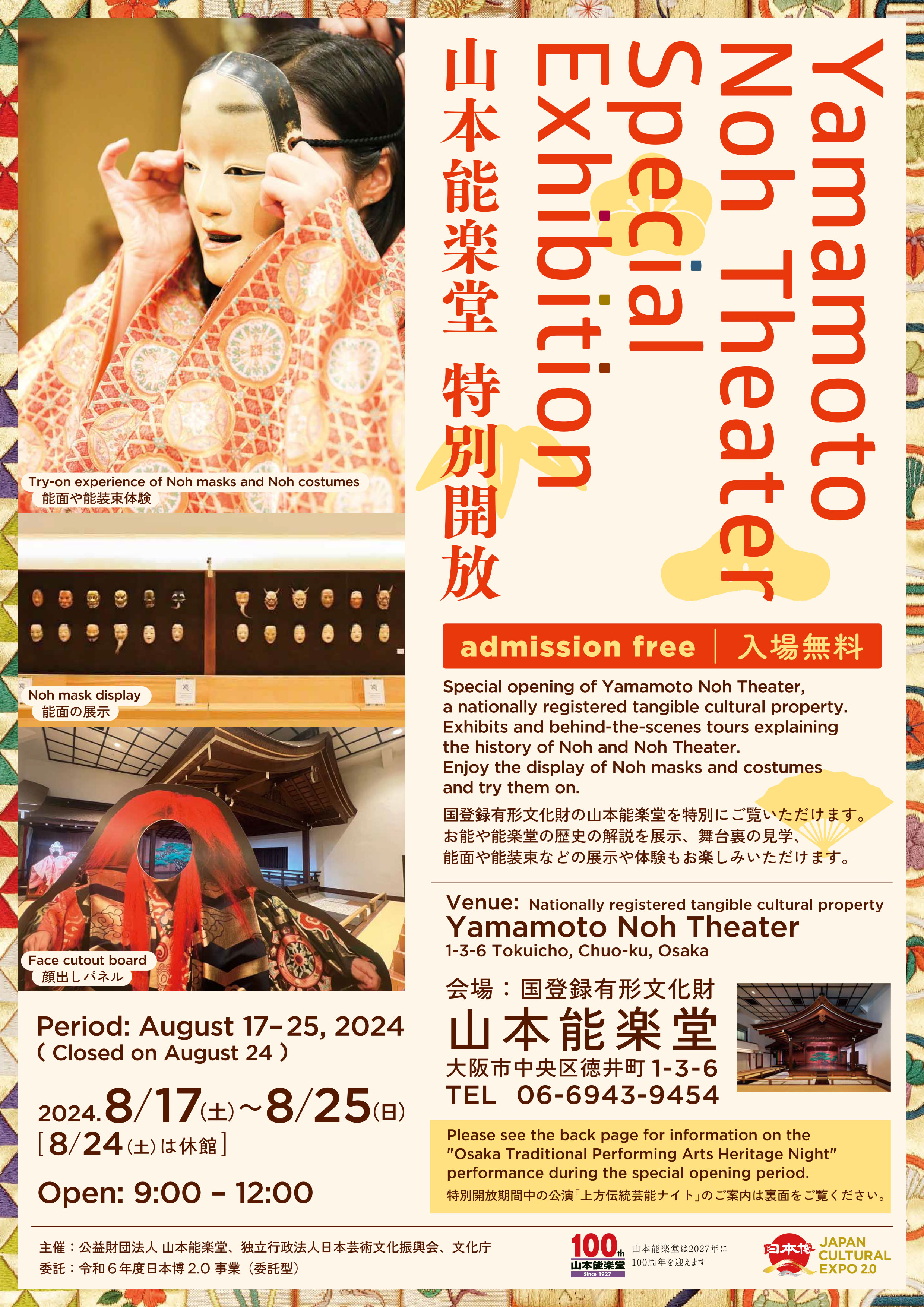 主催:主催:大阪・関西万博 能楽の魅力を発信する会、独立行政法人日本芸術文化振興会、文化庁 後援:水都大阪コンソーシアム、公益財団法人大阪観光局 協力:公益財団法人 大槻能楽堂、公益財団法人 山本、株式会社朝陽会館、一般社団法人 能楽奉賛会