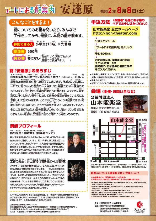能についての解説や段ボールでお面づくりを楽しんだ後、能「安達原」を鑑賞します。 子供1名につき保護者1名のみの受付となります。 工作ではホットボンドを使用する予定です。保護者の方は必ず工作にご参加ください。 恐れ入りますが新型コロナウイルス感染症感染拡大防止のため、ご見学は受付ませんのでご了承ください。