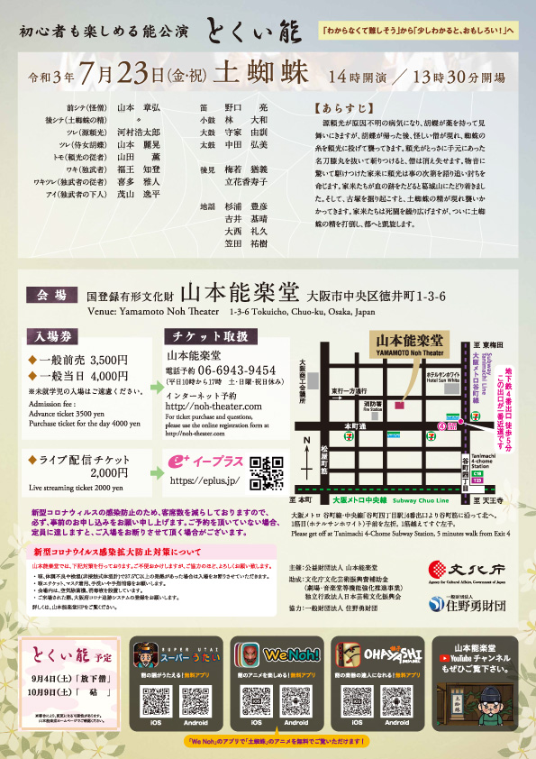 初心者でも楽しめる解説付き能公演。「土蜘蛛」はシテが和紙でつくられた蜘蛛の糸を投げる場面が見どころの演目です。