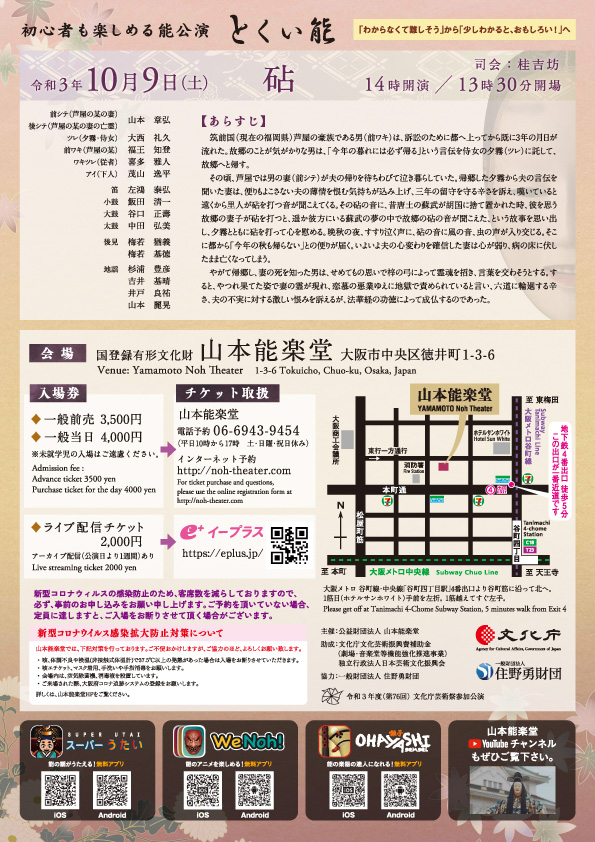 日時:2021-10-09 14:00〜16:00 料金:一般前売 3,500円 一般当日 4,000円 ※未就学児の入場はご遠慮ください。 ライブ配信チケット(アーカイブ配信あり) 2,000円(イープラスホームページより購入下さい。) 主催:山本能楽堂