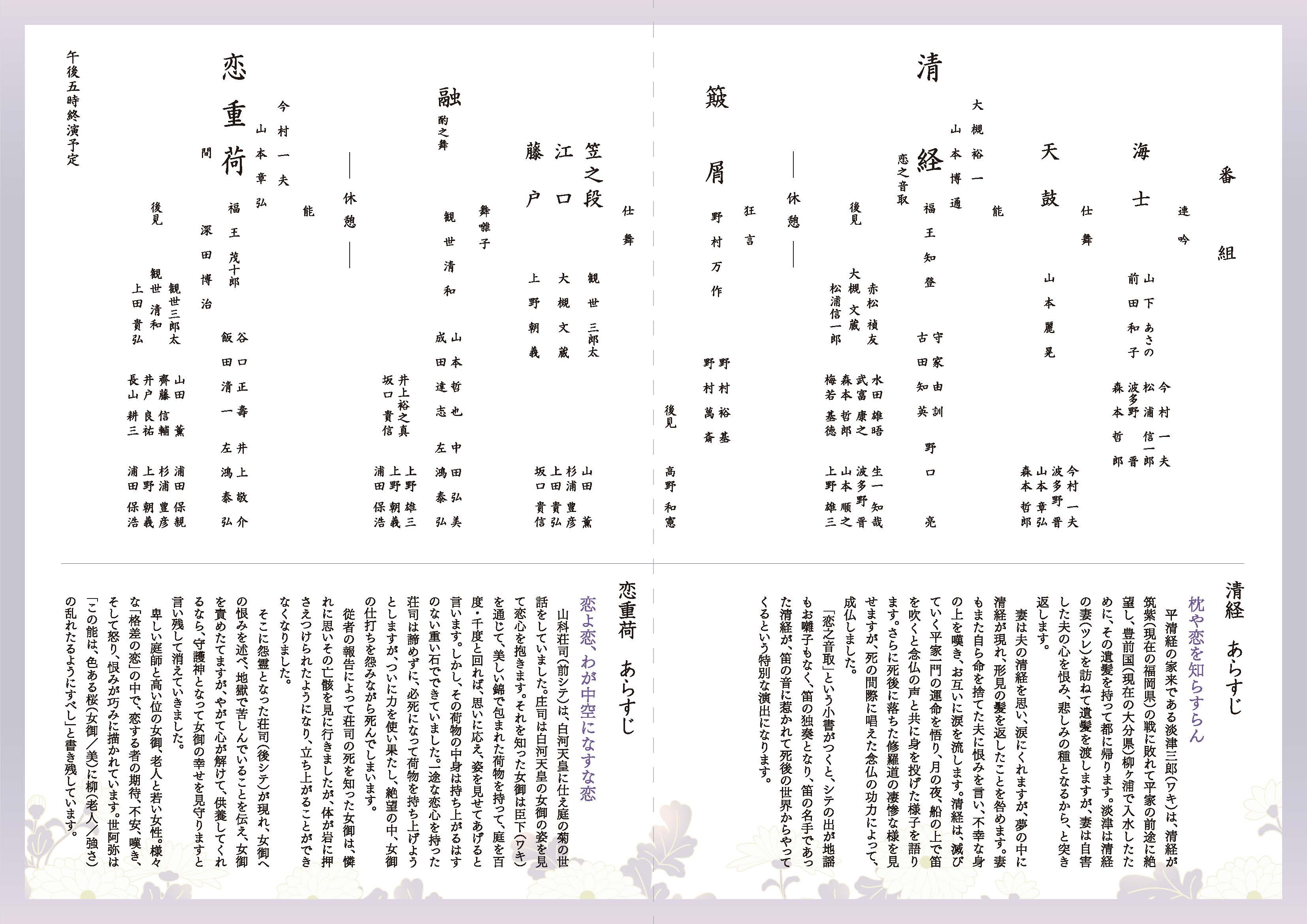 私は、観世御宗家様のお許しを頂戴し、「恋重荷」を、山本博通は「清経 恋之音取」をそれぞれ勤めさせて戴き、亡祖父・亡父、先祖への手向けとさせて頂きます。