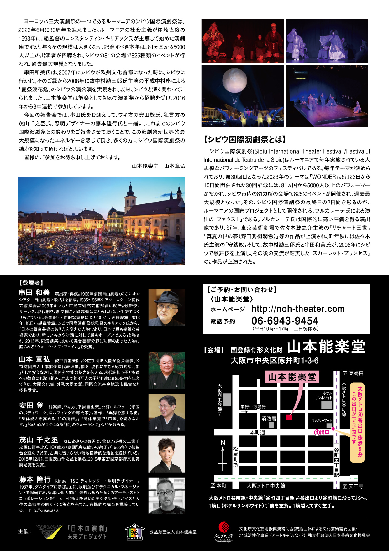 今回の報告会では、串田氏をお迎えして、ワキ方の安田登氏、狂言方の茂山千之丞氏、照明デザイナーの藤本隆行氏と一緒に、これまでのシビウ国際演劇祭との関わりをご報告させて頂くことで、この演劇祭が世界的最大規模になったエネルギーを感じて頂き、多くの方にシビウ国際演劇祭の魅力を知って頂ければと思います。