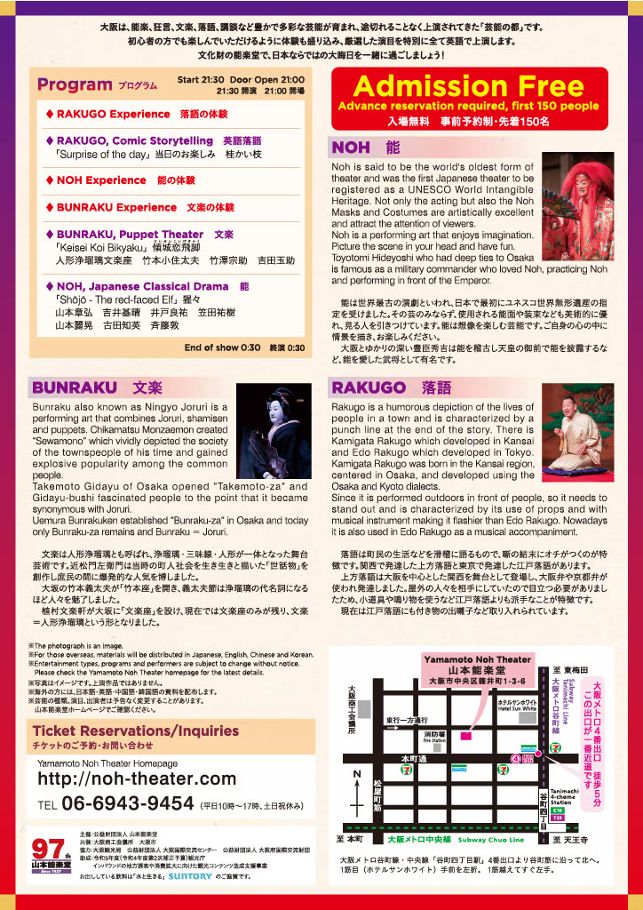大阪は、能楽、狂言、文楽、落語、講談など豊かで多彩な芸能が育まれ、途切れることなく上演されてきた「芸能の都」です。