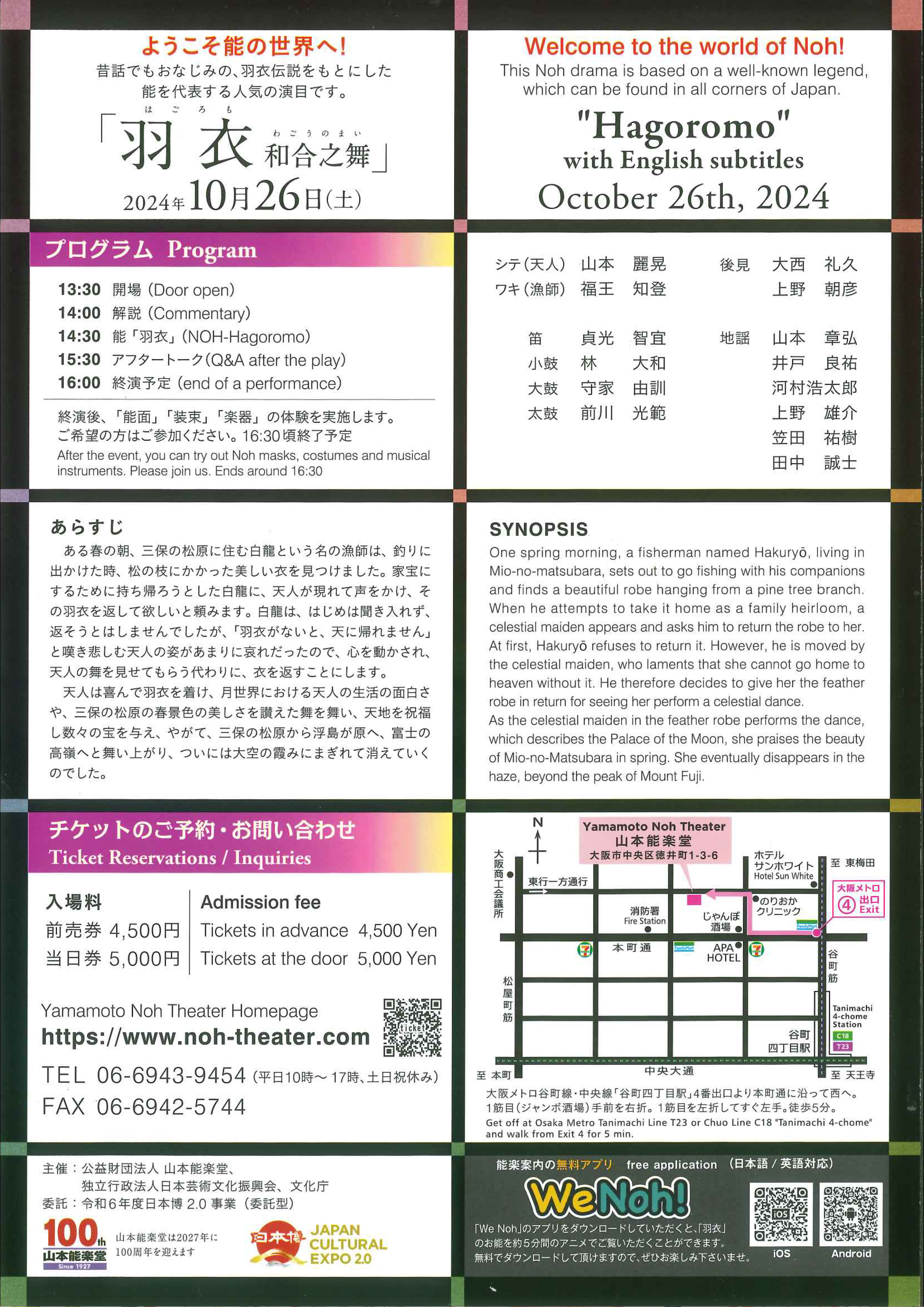 初心者でも楽しめる能公演「とくい能」、今回の演目は昔話でもおなじみの羽衣伝説をもとにした、能を代表する人気の「羽衣」です。