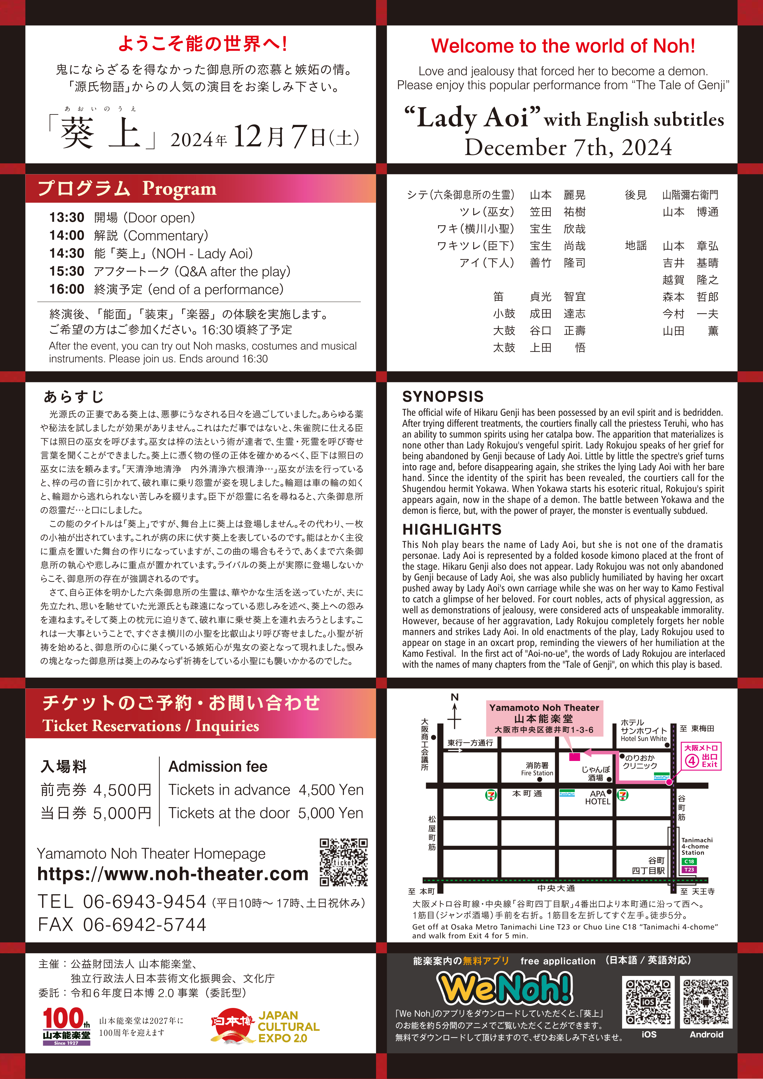 ようこそ能の世界へ! 初心者でも楽しめる能公演「とくい能」、今回の演目は鬼にならざるを得なかった御息所の恋慕と嫉妬の情。「源氏物語」からの人気の演目をです。 はじめての方にもお楽しみいただけるよう、上演前に解説の時間があります。また上演中外国人のお客様にもわかりやすいよう英語字幕を表示いたします。