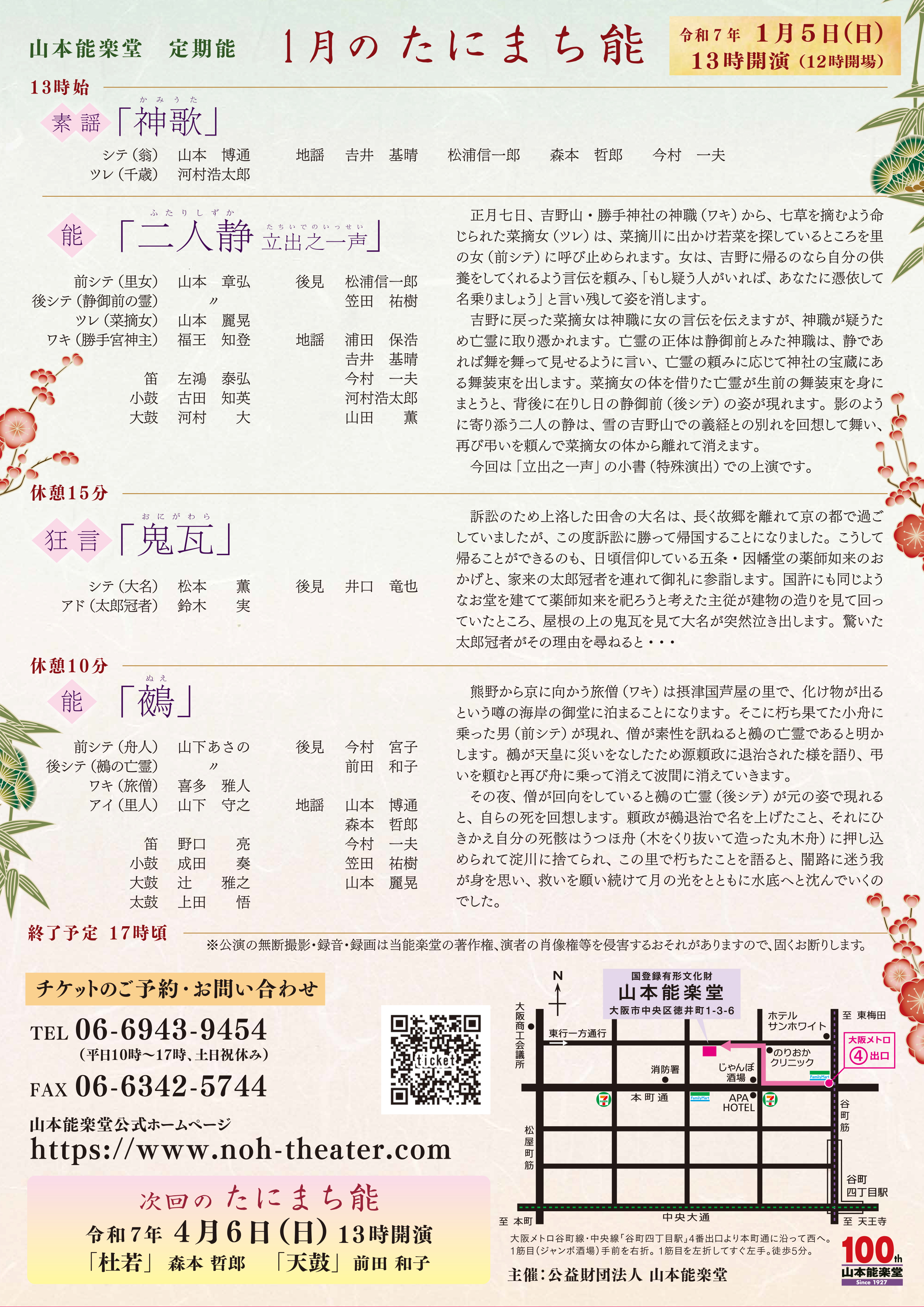 山本能楽堂の定期能、令和7年1月のたにまち能のお知らせです。 1月5日(日)13時開演(12時開場)終了予定は17時頃