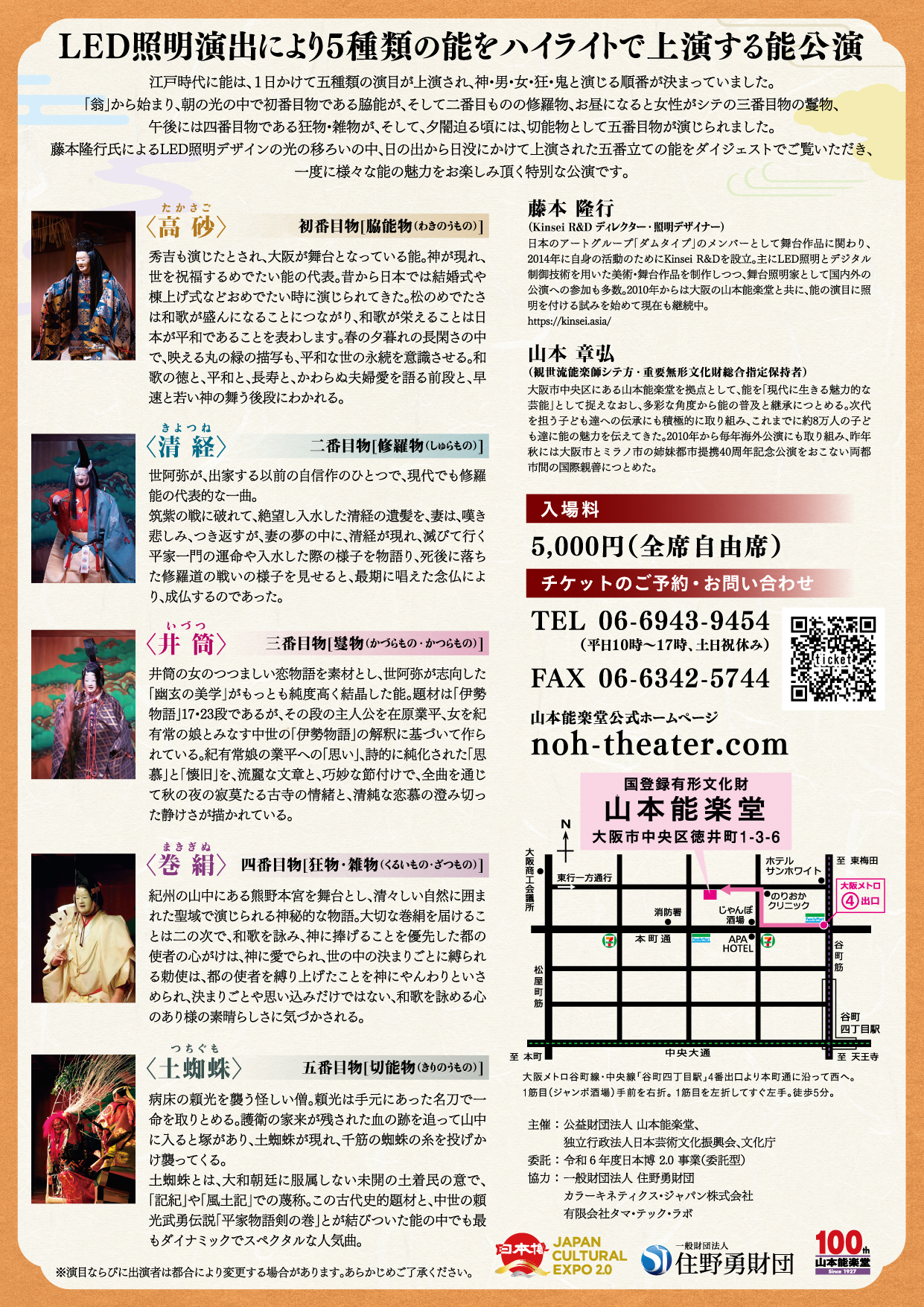 日時:2025-03-01 14:00〜16:00 料金:5,000円/ お1人様 (全席自由席) ・未就学児のご入場はご遠慮いただいております。 主催:公益財団法人 山本能楽堂 一般独立法人 住野勇財団