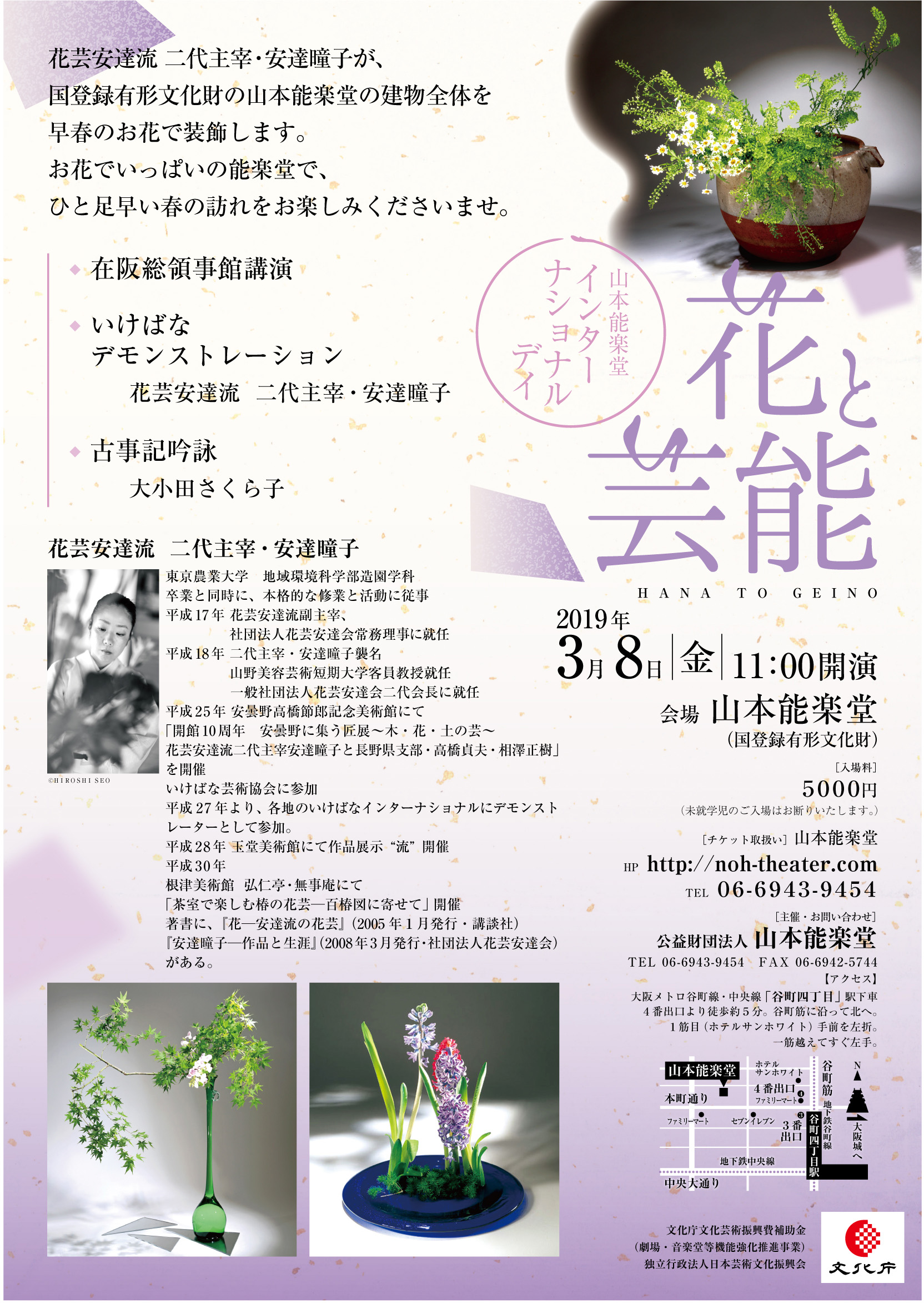 花芸安達流 二代主宰・安達曈子が、国登録有形文化財の山本能楽堂の建物全体を早春のお花で装飾します。 舞台では、半能「熊野」と、チェロの演奏をお楽しみいただきます。お花でいっぱいの能楽堂で、ひと足早い春の訪れをお楽しみください。