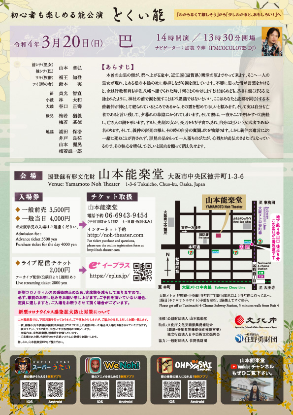 Date & Time: 2022-03-20 14:00〜16:00 Price: advance ticket: 3500 Yen door ticket: 4000 Yen Organizer: 山本能楽堂