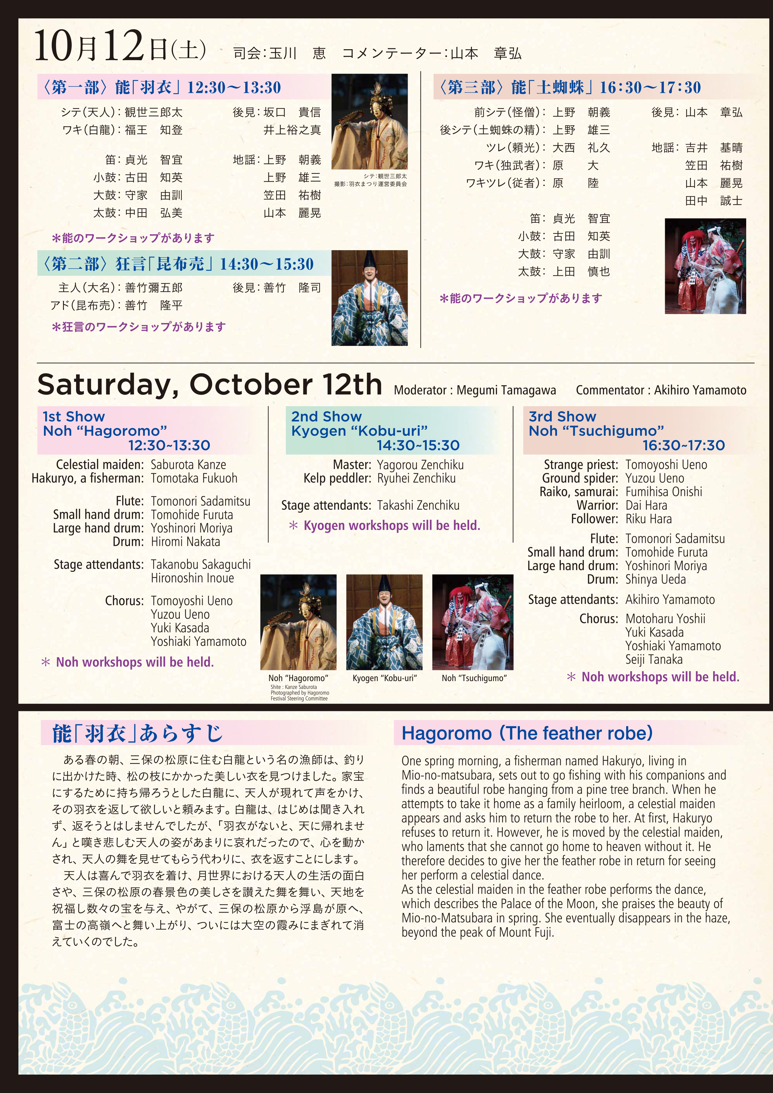 Date & Time: 2024-10-12 12:30〜17:30 Price: Organizer: 主催:大阪・関西万博 能楽の魅力を発信する会、独立行政法人日本芸術文化振興会、文化庁 後援:水都大阪コンソーシアム、公益財団法人大阪観光局 協力:公益財団法人 大槻能楽堂、公益財団法人 山本、株式会社朝陽会館、一般社団法人 能楽奉賛会