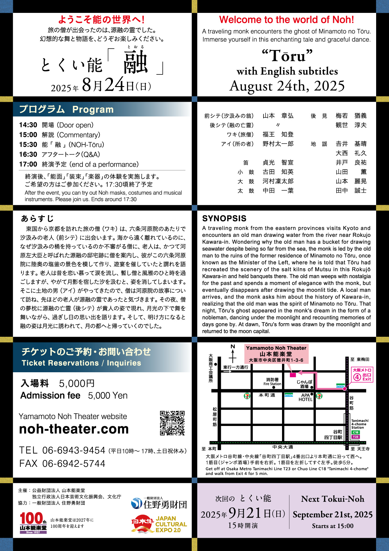 ※ After the event, you can try out Noh masks, costumes and musical instruments. Please join us. Ends around 17:30