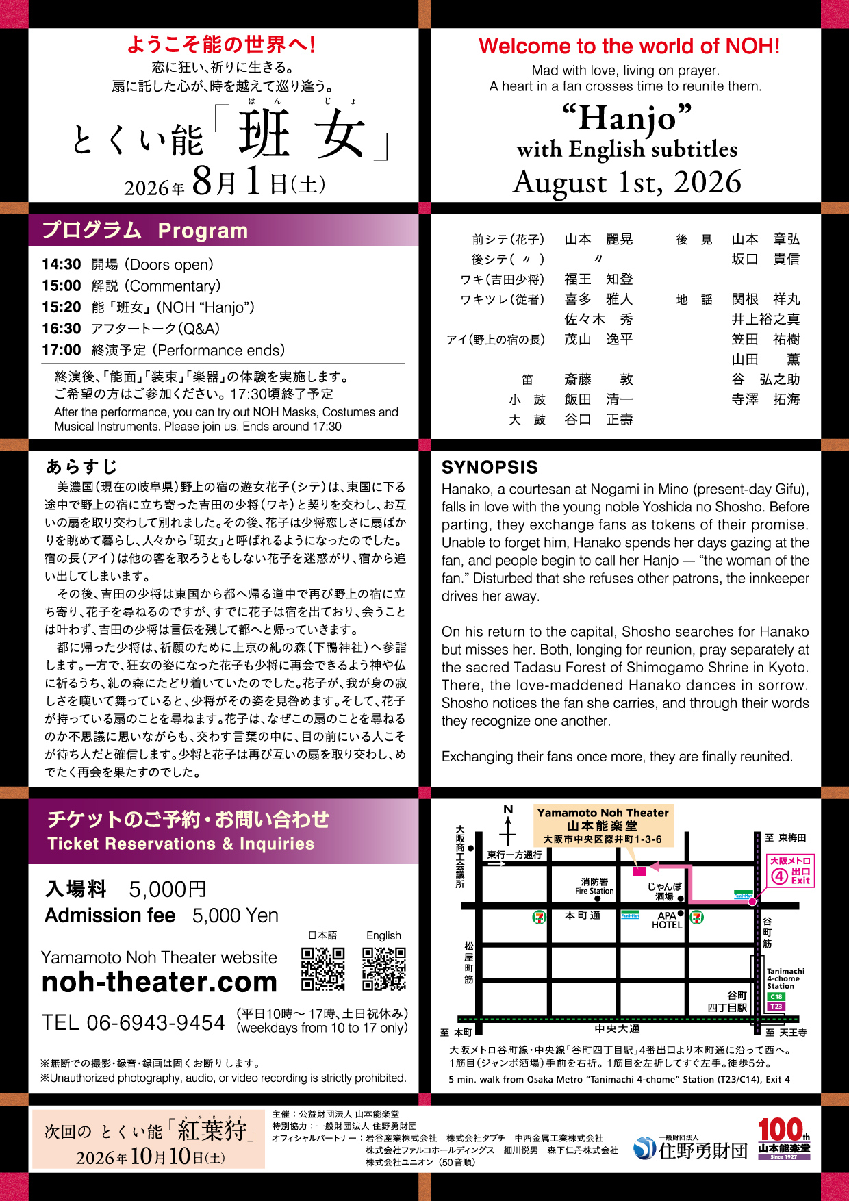 ようこそ能の世界へ!解説と能「班女(はんじょ)」の上演、能楽体験をお楽しみください。